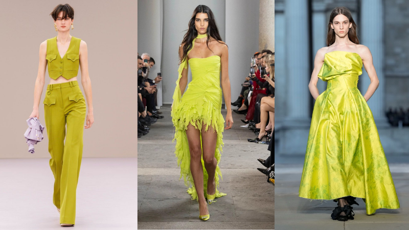 Đối nghịch hoàn toàn với sự tĩnh lặng của Jade là sự bùng nổ của màu xanh Wasabi. Đây là một tông xanh vàng đầy “ngông cuồng” và táo bạo, mang đến điểm nhấn thu hút cho trang phục, phụ kiện hoặc nội thất khi cần gợi cảm giác năng động và tươi mới dành cho những người không ngại trở nên khác biệt và thu hút mọi ánh nhìn. Sự xuất hiện của Wasabi trong bảng màu 2026 cho thấy chúng ta đang dần từ bỏ những giới hạn an toàn để đón nhận sự sáng tạo không biên giới. Trên sàn diễn, Wasabi không còn nằm ở chi tiết nhỏ mà bao phủ toàn bộ các thiết kế. Các nhà mốt biến Wasabi thành “ngôi sao” bằng cách biến hóa nó cho nhiều phong cách từ suit, váy cắt xẻ táo bạo và cả trang phục dạ hội. Gam màu này được tận dụng để tạo nên sự tương phản mạnh mẽ, mang lại cảm giác tươi mới và đầy tính thời đại.