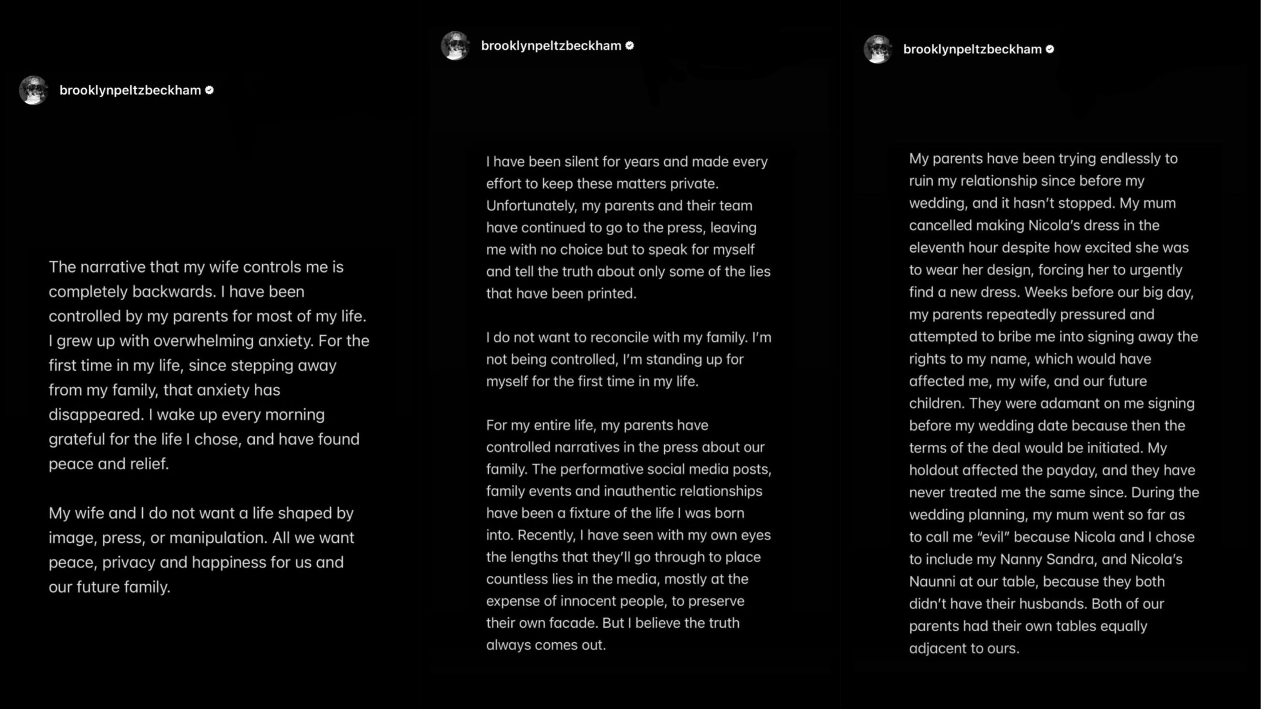 Liên quan đến những vấn đề như việc vợ chồng Beckham cô lập con dâu Nicola, gây sức ép buộc Brooklyn từ bỏ họ Beckham hay các mâu thuẫn xoay quanh lễ cưới, hiện tại mọi thông tin vẫn chỉ xuất phát từ lời kể một phía. Chưa có bằng chứng độc lập nào đủ sức xác nhận những cáo buộc này. Thực tế, việc cha mẹ không hài lòng với bạn đời của con cái không phải hiện tượng hiếm gặp và thường chỉ dừng ở phạm vi mâu thuẫn gia đình. Do đó, không ai có thể khẳng định điều gì thực sự diễn ra phía sau những lời tố cáo đang được công khai. Đáng chú ý, nếu vợ chồng Beckham thực sự độc hại như cách Brooklyn mô tả, phản ứng của các thành viên còn lại trong gia đình khó có thể giữ được sự im lặng hoặc đứng về phía cha mẹ. Việc các em của Brooklyn không ủng hộ anh cũng đặt ra nghi vấn về tính toàn diện của câu chuyện, cho thấy mâu thuẫn này phức tạp hơn một tuyến đối lập đơn giản giữa đúng và sai.