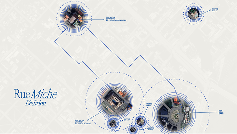 Rue Miche L’édition được phát triển trên diện tích 4.728 m² (số liệu nội bộ). Vị trí tại Union Square, giao lộ Đồng Khởi – Lê Thánh Tôn – Nguyễn Huệ, tòa nhà có kết nối trực tiếp với tuyến Metro số 1 — Ga Nhà hát Thành phố (tầng hầm).