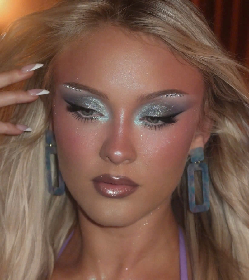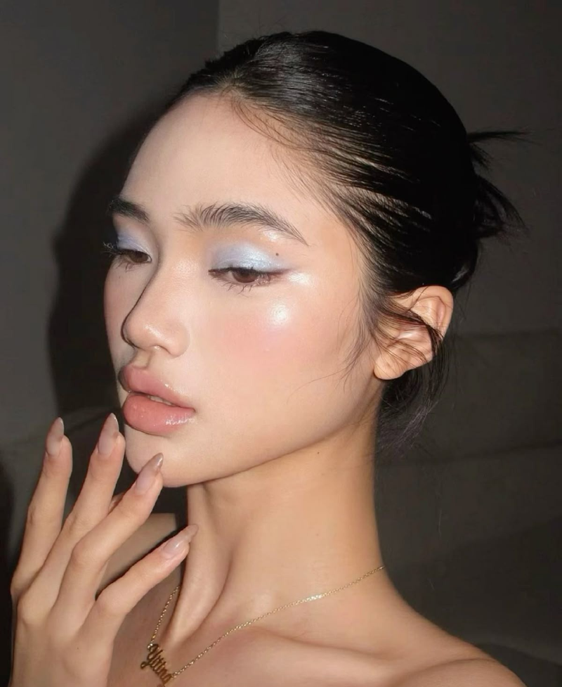 Một cách trang điểm khác mang đậm tinh thần hiện đại mà bạn có thể thử là sử dụng sắc bạc pha xanh làm điểm nhấn ở trung tâm khuôn mặt. Bạn hãy tập trung highlight ở những vị trí bắt sáng tự nhiên như sống mũi, gò má, trán và cằm, nơi ánh sáng dễ dàng phản chiếu để tạo hiệu ứng trong trẻo nhưng vẫn sắc sảo. Sắc bạc ánh xanh không chỉ mang lại cảm giác “lạnh” đầy tinh tế mà còn giúp làn da trông căng bóng và có chiều sâu hơn dưới ánh sáng.