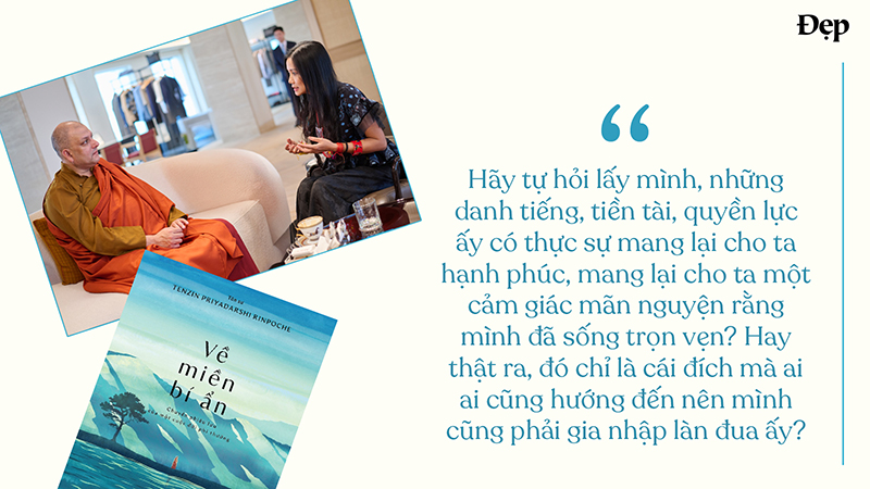 Đẹp gặp Tôn sư Tenzin Priyadarshi Rinpoche trong buổi ra mắt bản dịch tiếng Việt của “Về miền bí ẩn” tại Hà Nội. Cuộc trò chuyện xoay quanh những khắc khoải bắt nguồn từ nơi cổ xưa nhất nhưng lại kết nối đến những mối bận tâm hiện đại nhất. Qua đó, mỗi chúng ta có thể tìm thấy lòng can đảm để khám phá miền bí ẩn trong chính tâm hồn mình, chạm vào khoảng bình an hạnh phúc đang rung ngân, đánh thức dòng suối nguồn của trí tuệ, sự thấu hiểu và lòng nhân hậu.