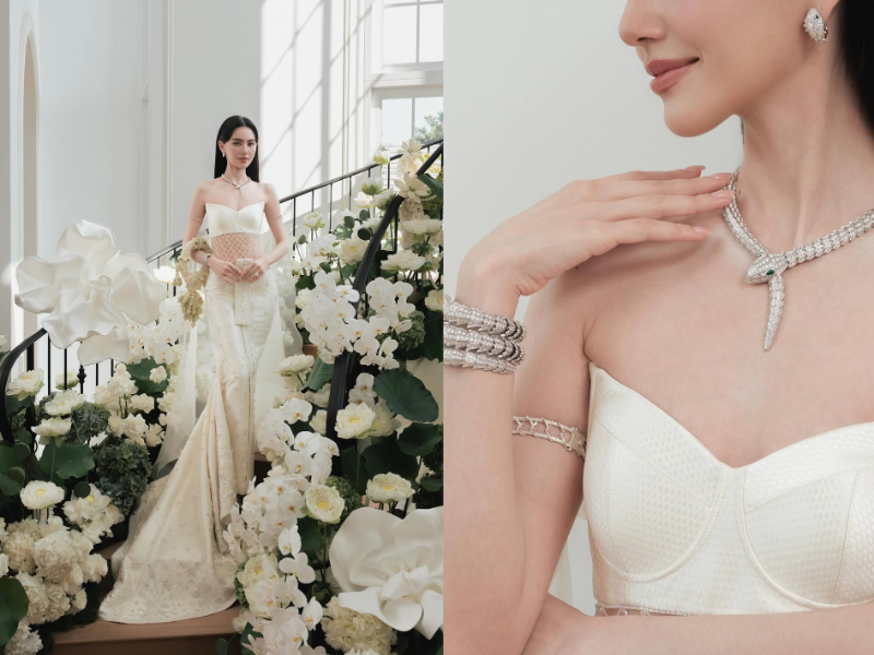 Chiếc đầm cưới của Mai Davika mang phom dáng đuôi cá, được thiết kế theo tinh thần may đo hiện đại nhưng vẫn giữ nguyên cấu trúc truyền thống Thái với chiếc sabai khoác sải vai cổ điển. Toàn bộ thân váy được thêu tay bằng họa tiết hoa sen và cặp rắn tình nhân – biểu tượng giao hòa của âm dương, gắn liền với hình tượng rắn trong trang sức Bvlgari mà cô dâu lựa chọn. Mỗi chi tiết trên trang phục như một nhịp thở của tình yêu và của bàn tay nghệ nhân Thái, hòa quyện giữa sự tinh xảo của kỹ thuật may đo và chiều sâu văn hóa bản địa.