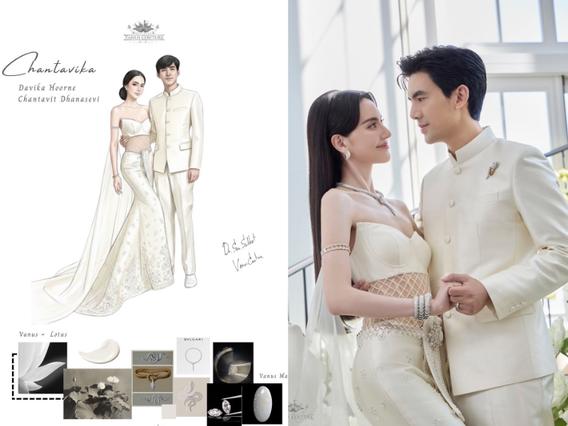 Lễ phục cưới của Mai Davika vào ngày 9/11 vừa qua được gửi gắm cho Vanus Couture. Đây là thương hiệu Thái duy nhất được chọn thực hiện trang phục cưới truyền thống cho cặp đôi. Với chủ đề “Tình yêu thuần khiết”, thiết kế lấy hoa sen, biểu tượng của sự thanh cao và vĩnh cửu, làm trung tâm sáng tạo.