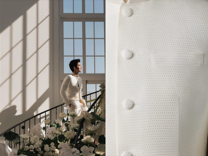 Trong khi đó, chú rể Ter Chantavit xuất hiện trong bộ trang phục Thái Hoàng Gia được may từ cùng tấm lụa Lamphun, thể hiện tinh thần đồng điệu và sự hòa hợp trọn vẹn. Việc cùng sử dụng một nguồn chất liệu không chỉ là quyết định thẩm mỹ mà còn là hành động tôn vinh nghề dệt truyền thống, một phần linh hồn của văn hóa Thái. Từng nếp gấp, từng đường cắt được tính toán tỉ mỉ để tôn lên vẻ trang trọng, mà vẫn giữ được phong thái tự nhiên và nền nã.