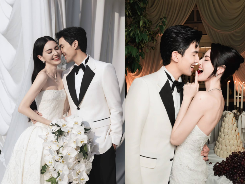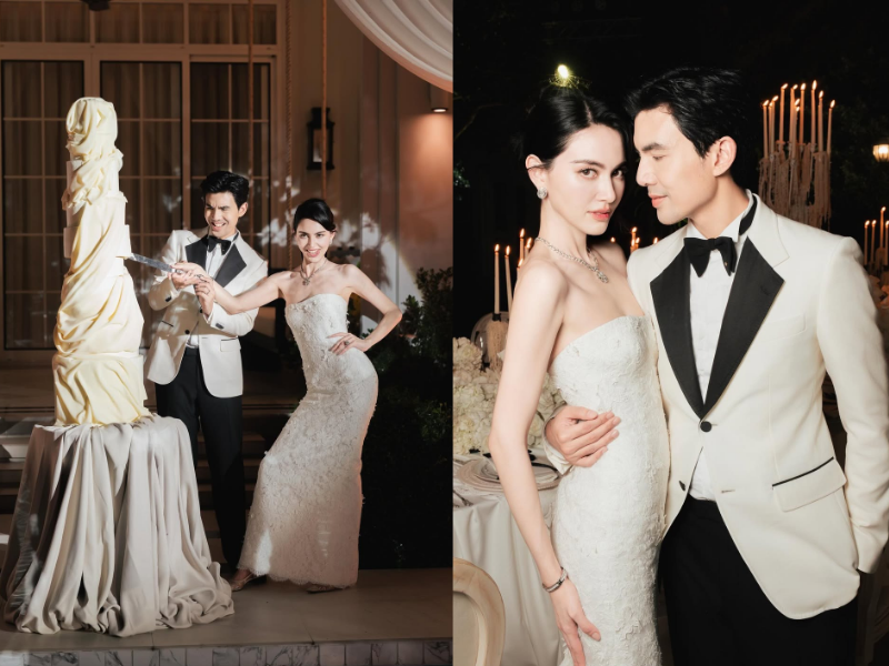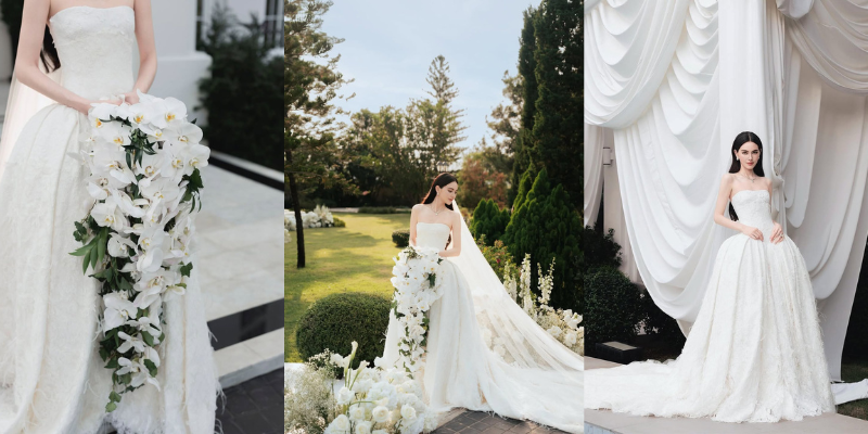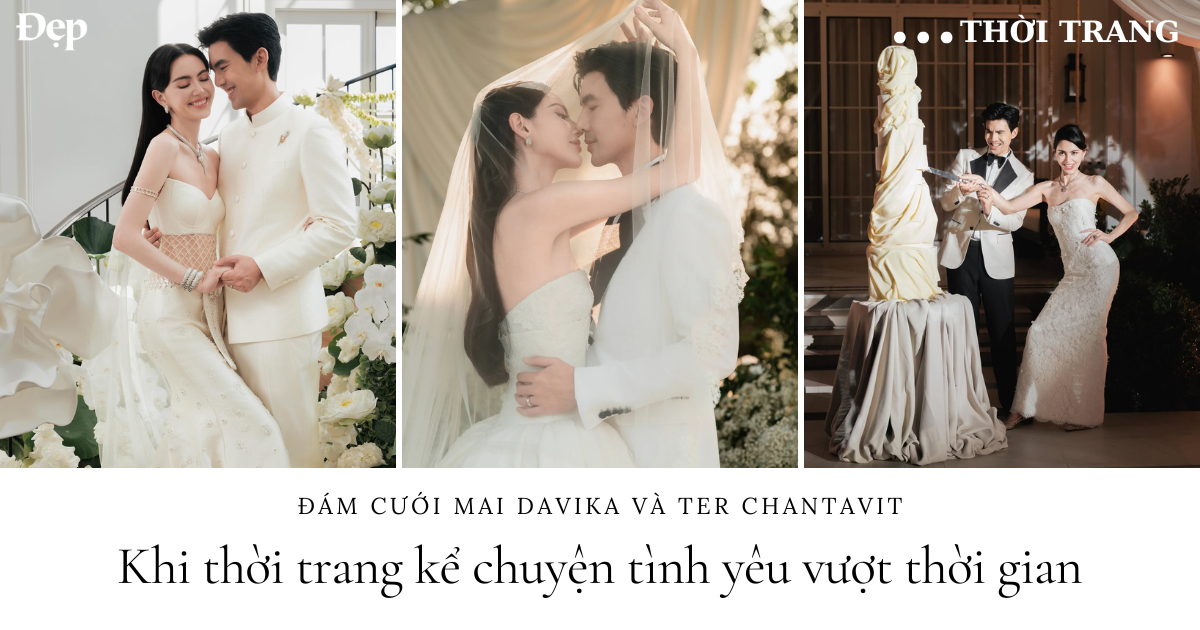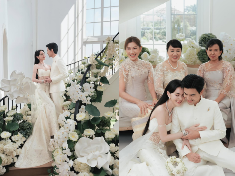 Giữa không gian được nhuộm trắng của buổi tiệc cưới, câu chuyện tình hơn 12 năm của Mai Davika và Ter Chantavit được tái hiện bằng ngôn ngữ của thời trang.