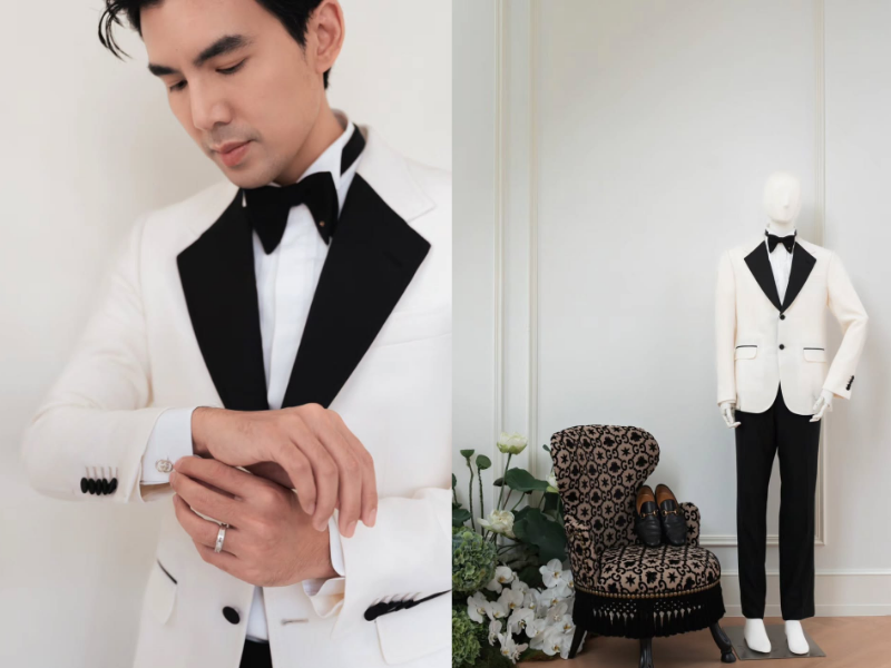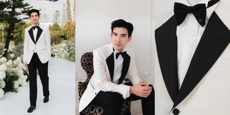 Bên cạnh đó, chú rể Ter Chantavit xuất hiện trong bộ tuxedo Made To Order (MTO), được thực hiện bởi các thợ may bậc thầy của Gucci tại Siam Paragon. Chất liệu len barathea 100% màu trắng ngà, dệt kiểu broken twill, đi cùng ve áo nhọn bằng grosgrain đen tạo nên vẻ ngoài vừa cổ điển vừa hiện đại. Chiếc sơ mi trắng bên trong bằng cotton poplin, phần ngực xếp ly, phần lưng kiểu Uni-Yoke, cùng cúc măng sét logo Gucci.