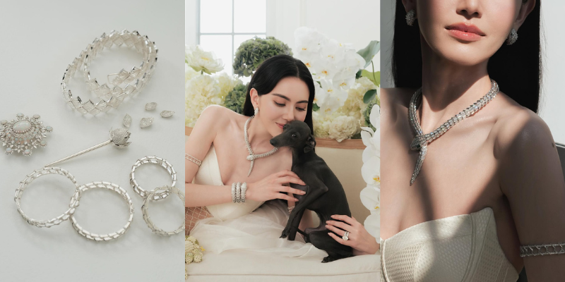 Vanus Couture hoàn thiện tổng thể bằng bộ nữ trang mang tên “Vanajmali”, nghĩa là “Tình yêu thuần khiết vượt thời gian”. Lấy cảm hứng từ hoa sen, kết hợp cùng hoa văn cổ truyền Thái, bộ trang sức gồm 4 món, từ cài tóc, dây chuyền đến thắt lưng được chế tác bằng opal và zircon trắng.