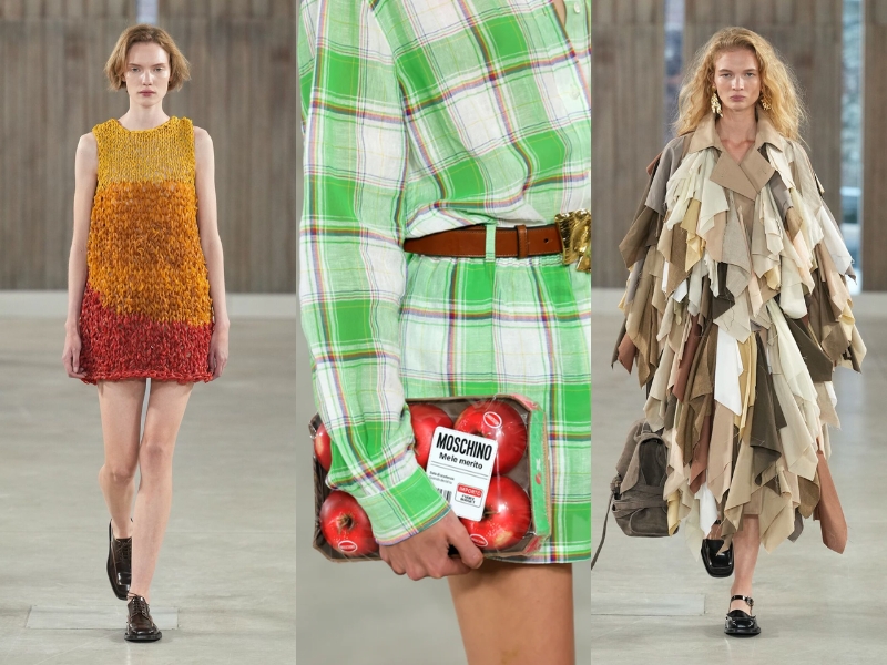 Sự hài hước có thể tạo nên điều kỳ diệu giữa lịch trình dày đặc các buổi trình diễn, và có lẽ đó chính lý do tồn tại của Moschino. NTK Adrian Appiolaza đã trình làng một trong những BST ấn tượng nhất của mình. BST Moschino Xuân hè 2026 được lấy cảm hứng từ Arte Povera – một phong trào nghệ thuật cấp tiến của Ý từ cuối những năm 1960, với nội dung là sử dụng những vật liệu phi truyền thống như đất, giẻ rách hay cành cây để thách thức những ý tưởng về chủ nghĩa thương mại và chủ nghĩa tinh hoa. Nguyên lý cốt lõi là tái sử dụng, hiệu chỉnh và tái hiện. BST trải dài từ chiếc áo thun in chữ đơn giản đến những thiết kế mang tính khái niệm hơn, với vải thô, dây thừng và ren gỗ được nâng tầm thành trang phục dạ hội. Một chiếc bao tải đựng khoai tây được tái cấu trúc thành một thiết kế áo dạ hội mỏng manh, thách thức những giá trị thông thường. Có những chiếc túi độc đáo với hình dạng như một hộp táo mua ở siêu thị hoặc một chiếc xô đựng đồ đi biển. Đây chính là tinh hoa của Moschino – mỉa mai, thông minh và ngọt ngào đầy phá cách.