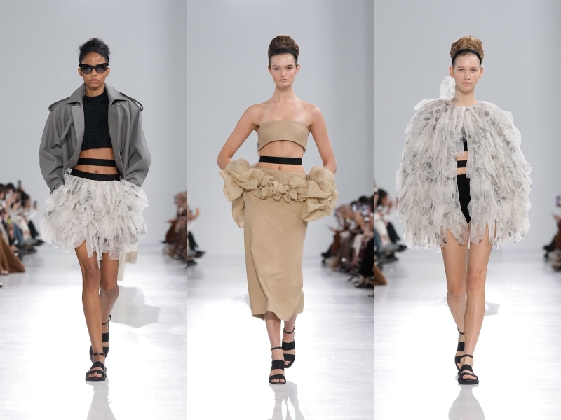 Max Mara cũng mang đến một chút tinh nghịch đáng ngạc nhiên. Vốn là người chú trọng vào tính thực tế và cảm giác thoải mái của trang phục, NTK Ian Griffiths lần này lại lấy cảm hứng từ Madame de Pompadour – nhà bảo trợ nghệ thuật nổi tiếng và là người tiên phong cho phong cách Rococo xa hoa. Các chi tiết hoa mỹ được thêm vào những món đồ kinh điển: bộ trang phục mở màn là chiếc áo khoác trench coat có thắt lưng, tay áo ngắn được tạo nên từ những vòng xoáy vải tạo hình hoa. Ở những nơi khác, các lớp vải organza được kết hợp lại trông giống như cánh hoa hoặc lông vũ. Chúng chính là những kiểu dáng mà bạn có thể hình dung sẽ được diện bởi “Nữ hoàng sắc đẹp” người Thái Lan Faye Peraya Malisorn – một trong số các khách mời của Max Mara.