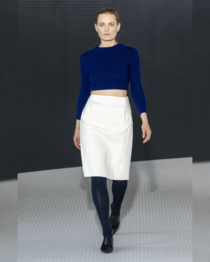 Đối với Simone, chủ nghĩa tối giản ngày nay nằm ở những đường cắt may sắc sảo, những khối màu đậm và một phom dáng hợp lý, chống lại mọi thứ trông có vẻ dư thừa. Nhưng đừng nhầm lẫn giữa sự đơn giản và an toàn. Những chiếc váy xuất hiện gần như từ sau ra trước – áo bralette được hé lộ qua những lỗ nhỏ gọn trên ngực – mang đến cho BST nét hiện đại riêng biệt. Chân váy ánh kim được kết hợp với áo hoodie xanh navy, trong khi denim xanh dương đậm kết hợp với áo len color block mang đến vẻ ngoài sành điệu hằng ngày. Trung thành với truyền thống nhưng vẫn hướng về tương lai – một khởi đầu thành công trong thầm lặng cho Simone Bellotti, ngôi sao khiêm tốn của làng thời trang.