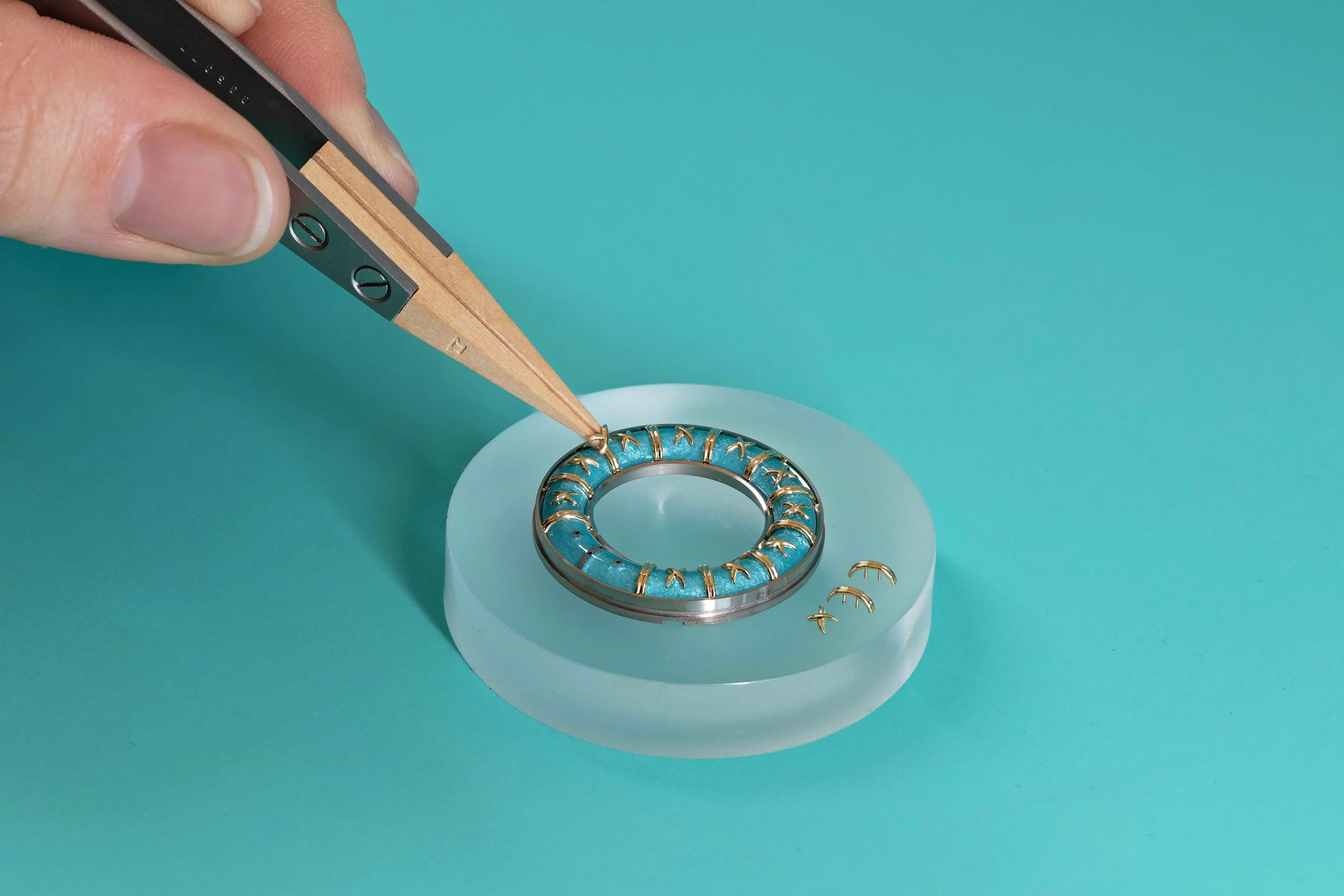 Quy trình chế tác vòng xoay đòi hỏi tổng cộng 65 giờ, trong đó 55 giờ cho công đoạn tráng men và 10 giờ để chế tác, lắp đặt các mũi thêu vàng. Với mỗi vòng men Tiffany Blue®, quy trình paillonné ba bước gồm đặt lá vàng hoặc bạc, phủ men rồi nung được lặp lại tới ba lần để đạt độ sâu và sự phong phú của màu sắc, tỏa sáng với độ rực rỡ đặc biệt.