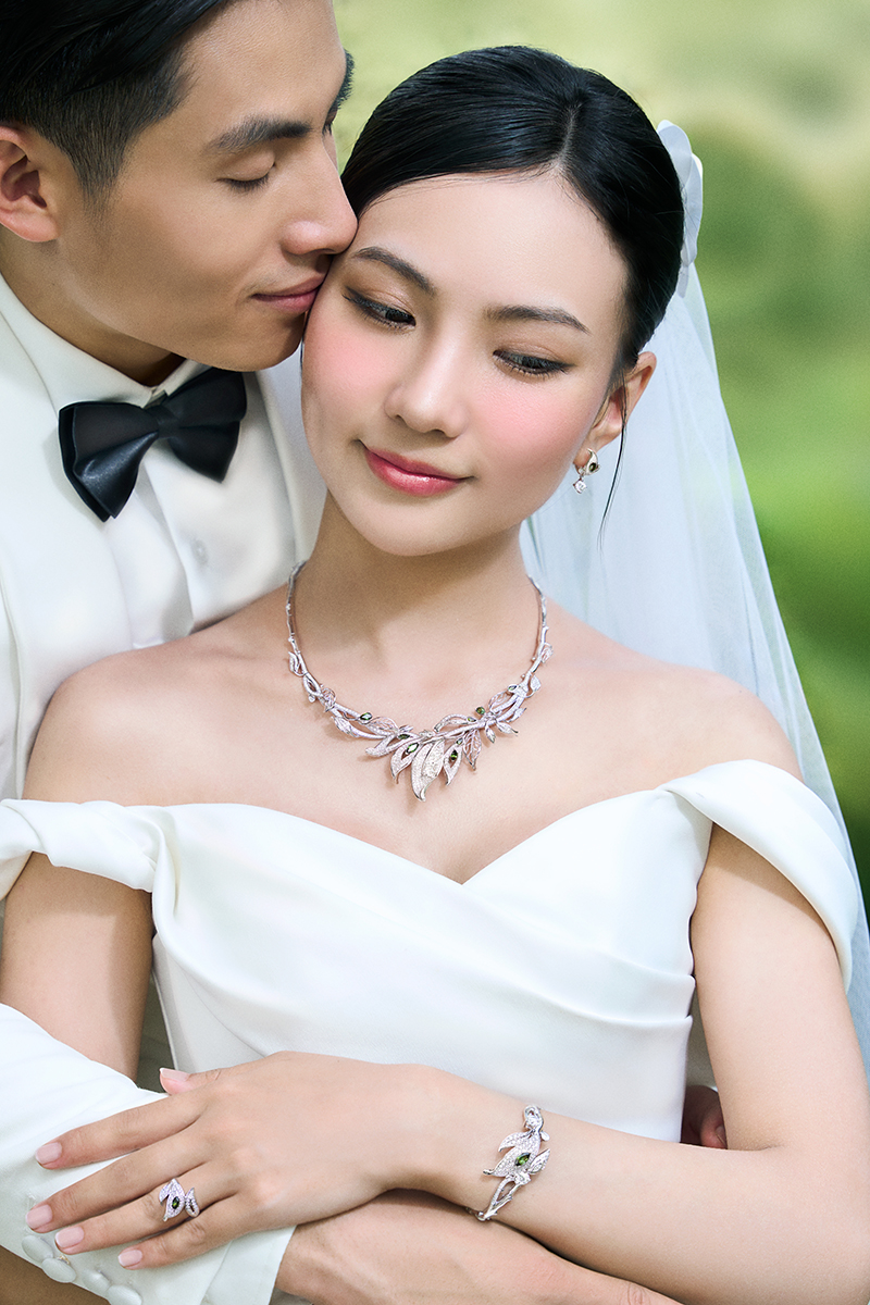Trong khoảnh khắc sánh đôi bước lên lễ đường, bộ trang sức cưới “Lá Ngọc Cành Vàng” được đính kết kim cương tinh tuyển và đá Tourmaline là lựa chọn mà các nàng dâu không thể bỏ qua. Sự kết hợp tinh tế giữa kim cương tinh tuyển cùng đá Tourmaline xanh mê hoặc tạo nên dải màu tươi mới, mang tới hiệu ứng thị giác tỏa sáng lung linh, giúp cô dâu thêm rạng ngời khi xuất hiện cùng bộ váy cưới.