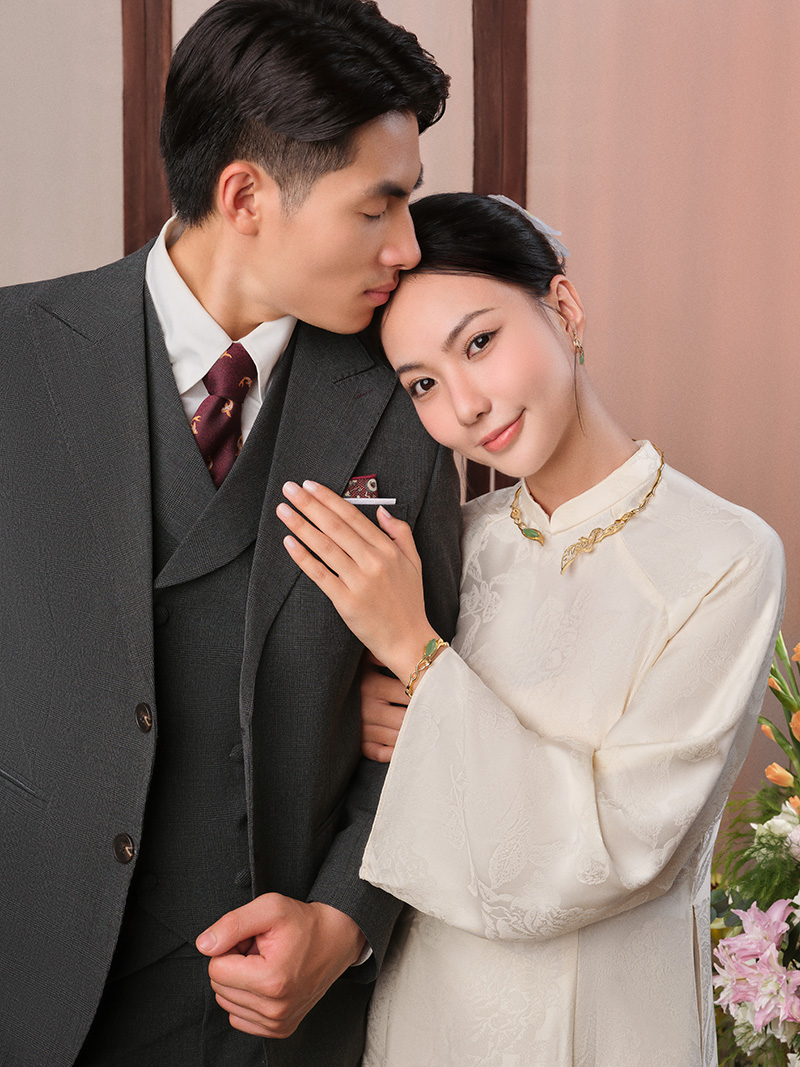 Trong các buổi lễ truyền thống như Đính hôn hay Vu Quy, với trang phục áo dài, bộ trang sức cưới “Lá Ngọc Cành Vàng” chất liệu vàng 24K hay 18K cùng đá Aventurine chính là lựa chọn hoàn hảo tôn nét đẹp cổ điển cho các nàng dâu vào khoảnh khắc nên duyên.