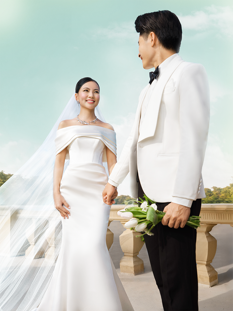 Với thiết kế hiện đại và sắc màu tinh tế, bộ trang sức kim cương “Lá Ngọc Cành Vàng” cho phép nàng dâu dễ dàng biến hóa phong cách. Từng chi tiết từ hình dáng của viên đá, cành vàng uyển chuyển đến sắc màu đá đều được tính toán để hoàn thiện tổng thể trang phục cưới, nâng tầm vẻ đẹp cá nhân và gu thẩm mỹ tinh tế.