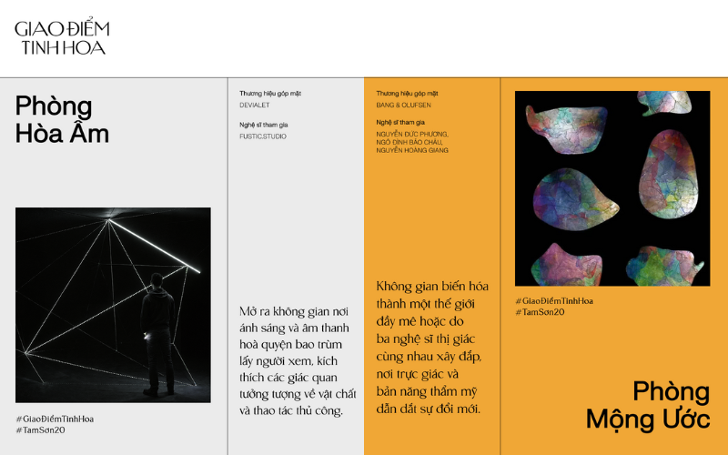 Triển lãm “Giao điểm tinh hoa” có quy mô lớn với diện tích lên tới 1000 m2, trên 100 tác phẩm và vật phẩm tinh tuyển từ 20 thương hiệu xa xỉ hàng đầu thế giới. Đặc biệt, sự góp mặt của 8 gương mặt nghệ sĩ tiêu biểu của thế hệ 8x và 9x cùng năng lượng tích cực và tinh thần cởi mở sẽ mang đến đa dạng cách thức đối thoại với giá trị cốt lõi của Tam Sơn: thủ công, truyền thống và vẻ đẹp nguyên bản.