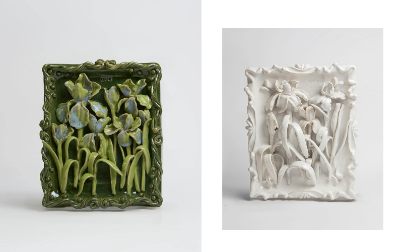 Tâm điểm của triển lãm là chuỗi điêu khắc gốm mang tên “Les Fleurs D’Iris”, một cuộc khai thác bằng điêu khắc về nhãn quan nội tâm và các trạng thái cảm xúc. Được tạo tác qua quá trình nung ở nhiệt độ cao, các tác phẩm mang vẻ đẹp hữu cơ với bề mặt gợi nhắc đến sự thô mộc của đá, đất và trầm tích. Song hành cùng gốm là các bức họa với lớp màu mềm mại và nét bút tiết chế, tạo nên những bố cục vừa riêng tư vừa gợi mở.