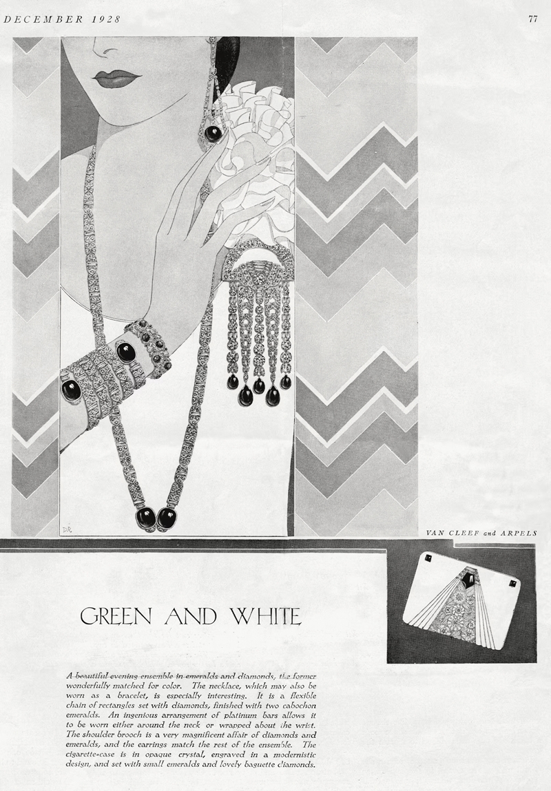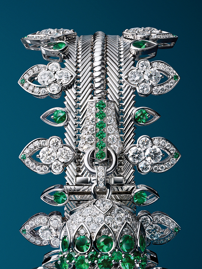 Một trong những kiệt tác trang sức biến đổi tiêu biểu, từng được trưng bày tại triển lãm “Gems” ở Bảo tàng Lịch sử Tự nhiên Paris là đôi vòng tay kiểu cuff của tiểu thư Daisy Fellowes. Năm 1926, nữ quý tộc Pháp, đồng thời là người thừa kế gia đình sản xuất máy may Singer, đã đặt Van Cleef & Arpels chế tác một chiếc vòng tay đính ngọc lục bảo và kim cương lấy cảm hứng từ họa tiết Ấn Độ. Hai năm sau, bà tiếp tục đặt thêm một phiên bản thứ hai để đeo đối xứng trên cả hai cổ tay. Điều đặc biệt là Maison đã sáng tạo ra một cơ chế nối hai chiếc vòng tay này lại với nhau, để có thể biến hóa chúng thành một chiếc vòng cổ duyên dáng.