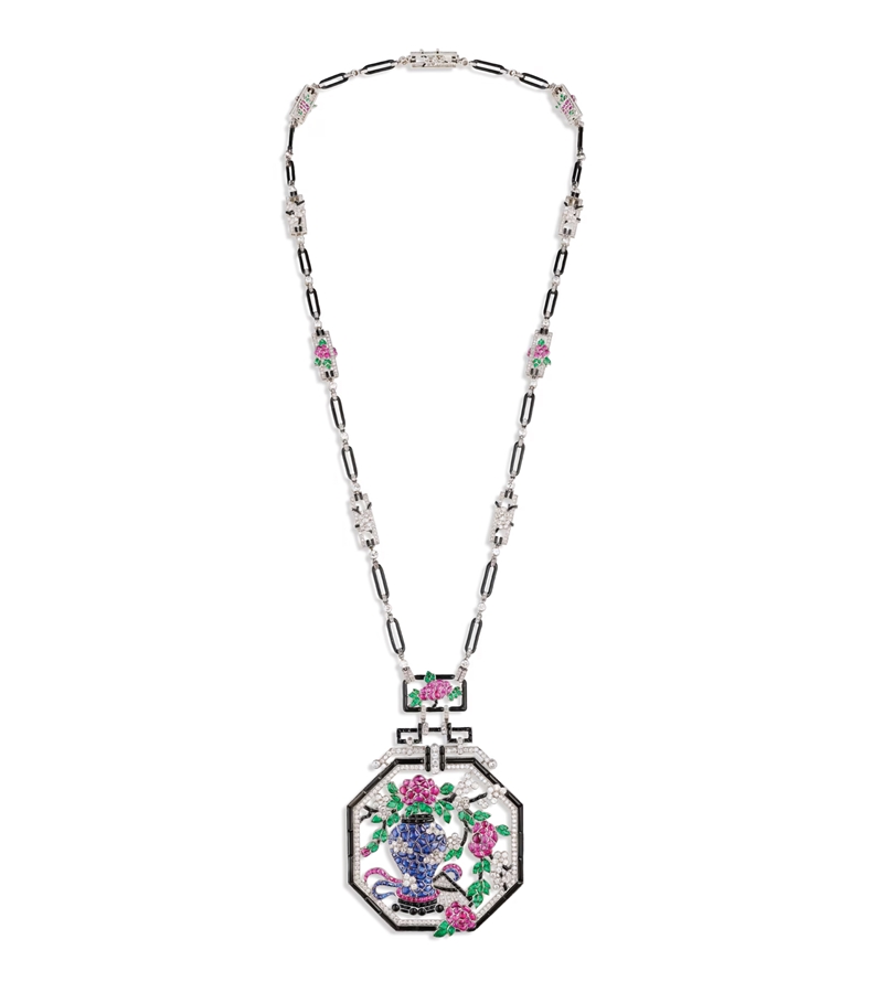 Năm 1924, Maison ra mắt một thiết kế vòng cổ Art Deco mô phỏng đóa hoa trong bình. Dây chuyền bạch kim được tô điểm bằng men màu, đá onyx, ngọc sapphire, ngọc lục bảo, ruby cắt giác cabochon, kim cương cắt giác hoa hồng và brilliant với phần mặt có thể tháo rời thành ghim cài áo nhờ hệ vít cánh bướm. Dù vận dụng một nguyên lý kỹ thuật từ thời tiền công nghiệp, Van Cleef & Arpels đã biến nó trở thành nền tảng cho một tư duy thiết kế mang tính cách mạng: đưa kỹ thuật tháo lắp thành ngôn ngữ thẩm mỹ.
