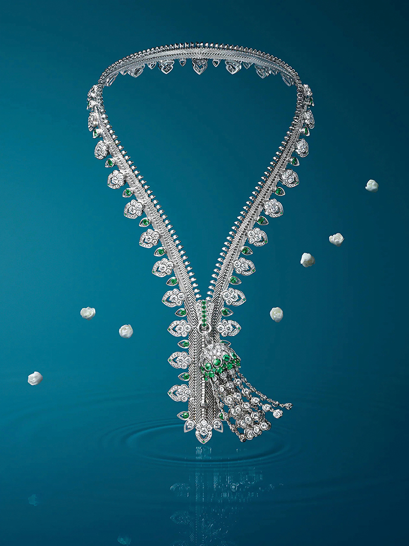 Kiệt tác Art Deco ra đời vào thập niên 20 này dự báo cho hai trong số những thiết kế mang tính biểu tượng nhất của Van Cleef & Arpels: dây chuyền Passe-Partout (1938) và dây chuyền Zip (1950). Theo chia sẻ từ bà Lise Macdonald, Passe-Partout được phát triển dựa trên chiếc devant de corsage – món trang sức từng được khâu trực tiếp lên phần trang trí trước ngực của đầm dạ hội, thường có hình dáng như một bó hoa, với cánh hoặc nụ có thể tháo rời để đeo đơn lẻ hoặc kết hợp tùy theo hoàn cảnh. Mẫu Passe-Partout Hawaï ra mắt năm 1939 đã đánh dấu bước đột phá khi kết hợp cụm hoa làm từ ruby và sapphire với chuỗi mắt xích bằng vàng 18K dẻo mềm kiểu Tubogas, một yếu tố mang tính hiện đại bất ngờ, lấy cảm hứng trực tiếp từ vòi sen. Cấu trúc linh hoạt này được hoàn thiện bởi một cơ chế khóa ẩn, cho phép người đeo dễ dàng biến hóa món trang sức thành vòng cổ ngắn, dây chuyền dài, thắt lưng hoặc vòng tay. Ngày nay, Passe-Partout đã được phát triển thành nhiều phiên bản mới, với thiết kế có thể gắn thêm tối đa năm chiếc trâm cài, tiếp tục khẳng định tính linh động và sáng tạo không giới hạn vốn là thế mạnh của Van Cleef & Arpels.