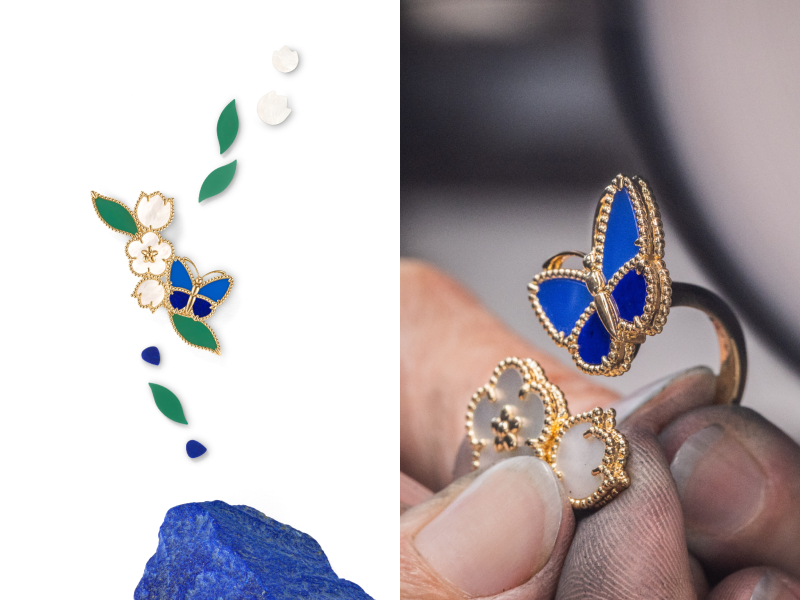 Những chất liệu điểm xuyết trên hình tượng cánh bướm và các yếu tố thực vật được tuyển chọn theo tiêu chí nghiêm ngặt, tiếp nối truyền thống chế tác của Van Cleef & Arpels. Trong các thiết kế Lucky Spring mới, đá agate được sử dụng với hai sắc độ: xanh lam trên phần cánh trên của bướm và xanh lục cho phần tán lá. Maison chỉ giữ lại một tỷ lệ rất nhỏ đá, ưu tiên những viên có độ đồng nhất cao về màu sắc, trong dải chuyển từ nhạt đến đậm. Những viên đá được chọn phải đạt độ màu đều và độ sáng rõ, nhằm tạo nên tổng thể có sự liên kết thị giác. Bên cạnh đó, bề mặt trang sức được bổ sung bằng xà cừ trắng. Lớp xà cừ này được lựa chọn với độ ánh hiếm gặp và những phản xạ biến đổi theo ánh sáng, góp phần hoàn thiện cấu trúc thị giác của từng thiết kế.