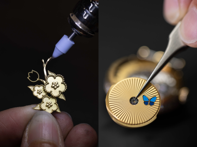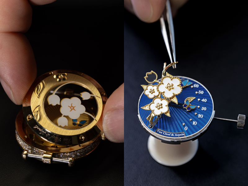 Mỗi chi tiết từ trọng lượng, kích thước đến lựa chọn vật liệu đều được tính toán nhằm hiện thực hóa câu chuyện trong khuôn vỏ 33 mm. Cặp hình tượng bướm được hoàn thiện bằng kỹ thuật tráng men, một lĩnh vực chế tác gắn bó với Van Cleef & Arpels.