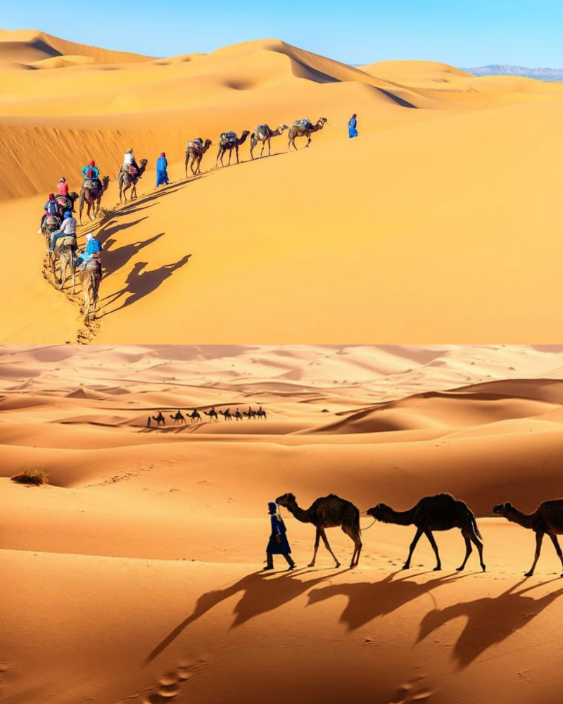 Điều khiến du khách choáng ngợp nhất là các kalut – những khối địa hình đá và cát cao lớn xếp thành hàng dài bất tận. Khi ánh mặt trời lên cao, chúng đổ bóng xuống nền cát vàng, tạo nên những hình khối mạnh mẽ như tác phẩm điêu khắc khổng lồ giữa thiên nhiên hoang dã. Đến lúc hoàng hôn, sa mạc Lut khoác lên mình gam màu cam đỏ rực rỡ, khiến khung cảnh trở nên huyền ảo đến mức nhiều người ví nơi đây giống như bề mặt của một hành tinh xa lạ.