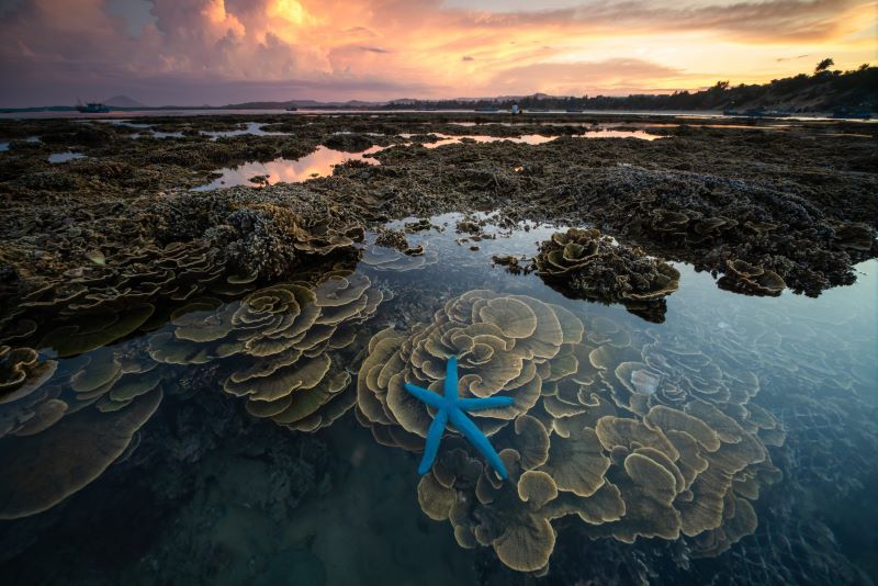 Ninh Thuận không chỉ đẹp trong nắng và gió mà còn ẩn giấu những báu vật địa chất tại Hòn Đỏ và Hang Rái. Hòn Đỏ là một tọa độ biệt lập nằm cách thành phố Phan Rang khoảng 20 km, nổi tiếng với rạn san hô cổ hóa thạch lộ khỏi mặt nước, tạo nên địa hình kỳ ảo như bề mặt của một hành tinh khác. Đây là địa điểm lý tưởng để hạ ván SUP vào lúc bình minh, khi mặt biển phẳng lặng.