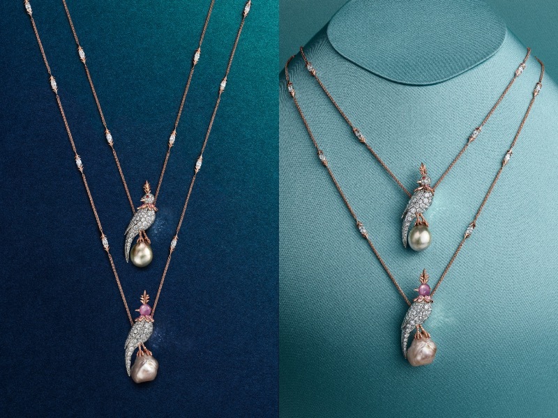 Các thiết kế nổi bật bao gồm trâm cài với chim phủ kim cương đậu trên ngọc trai trắng hơn 18 carat, hay mặt dây chuyền sử dụng ngọc trai xám nâu hơn 29 carat làm tâm điểm. Một thiết kế khác tái hiện mô-típ lưu trữ với cấu trúc vàng và bạch kim, đặt viên ngọc trai hơn 36 carat vào hình trái tim. Qua đó, ngọc trai không chỉ là vật liệu, mà trở thành điểm khởi nguồn sáng tạo, mở rộng di sản Jean Schlumberger bằng chính vẻ đẹp nguyên bản của đại dương.