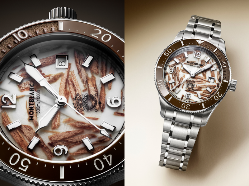 Phiên bản giới hạn 700 chiếc này được Montblanc khảm trực tiếp những mảnh gỗ bán hóa thạch hàng nghìn năm tuổi lên mặt số để vinh danh dải băng tích của vùng núi Alpes. Các mảnh gỗ cổ thụ được bảo tồn dưới lớp băng vĩnh cửu được cắt lát mỏng, sắp đặt khéo léo trong lớp nhựa resin trong suốt để tạo hiệu ứng “đóng băng” độc bản cho từng chiếc đồng hồ. Với vành bezel gốm nâu trầm mặc và bộ máy Calibre MB 24.17 mạnh mẽ, tạo tác này là một chương hồi ký về địa chất học, gắn kết người đeo với lịch sử hình thành của Trái đất qua hàng triệu năm.