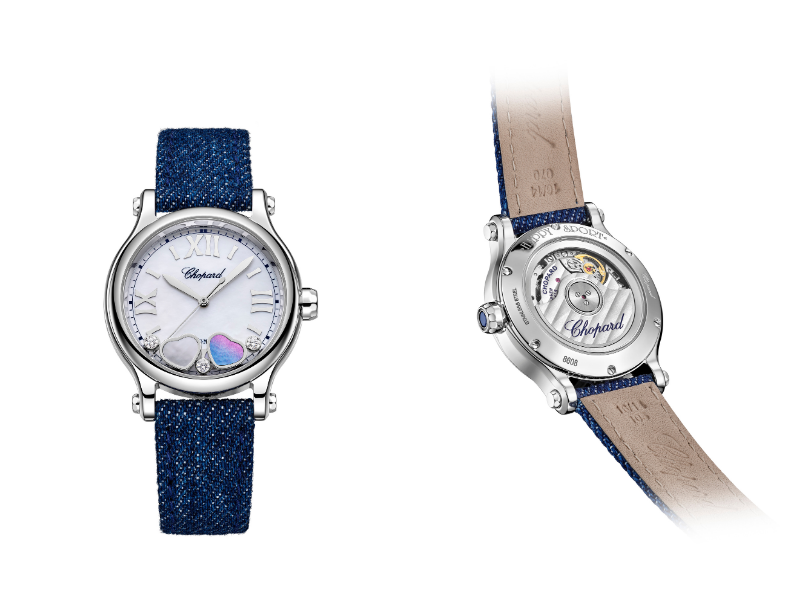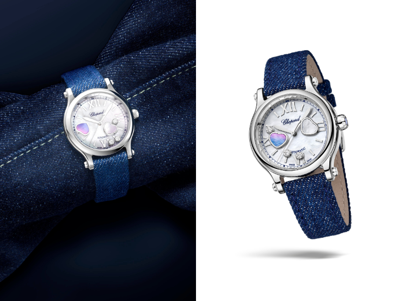 Trái ngược với vẻ cứng cáp của Alpine Eagle, dòng Happy Hearts mới là hiện thân cho tinh thần tự do và niềm vui sống với vũ điệu của ba viên kim cương trên mặt số. Cùng với đó, tinh thần sport-chic được nhấn mạnh khi kết hợp hài hòa dây đeo denim bình dị, thường ngày với sự cao quý của xà cừ bao quanh, tất cả được bao quanh bởi Lucent Steel™, sáng kiến của Chopard với tỷ lệ tái chế đạt 80%.