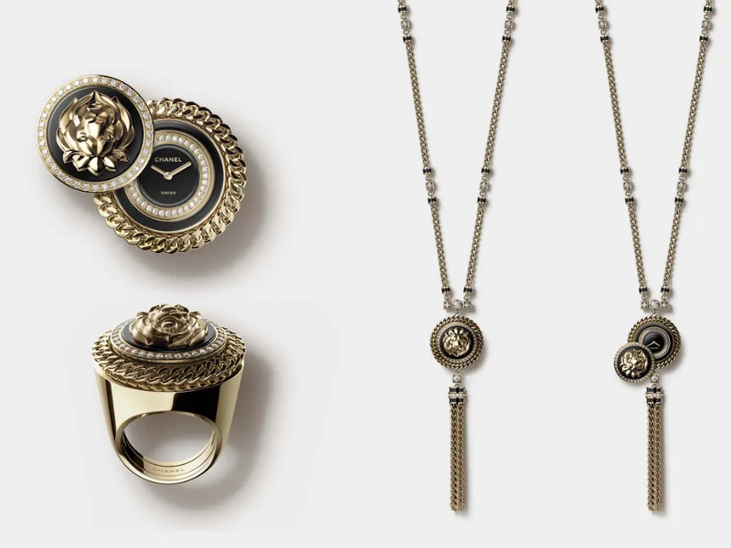 Hình ảnh Sư tử gắn liền với cung hoàng đạo và đại diện cho sức mạnh nội tại của Mademoiselle Chanel được tái hiện đầy uy nghi trong dòng Mademoiselle Privé. Ở lần ra mắt này, biểu tượng sư tử trở thành một tác phẩm điêu khắc thu nhỏ, ẩn giấu thời gian bên dưới chiếc nút áo biểu tượng của nhà mốt. Bộ đôi tạo tác gồm nhẫn và vòng cổ là sự hòa quyện trọn vẹn giữa kỹ nghệ chế tác kim hoàn và đồng hồ bí mật. Các tiểu tiết từ bờm sư tử được điêu khắc thủ công trong suốt 8 giờ đồng hồ đến kỹ thuật nạm đá tỉ mỉ xung quanh mặt số, đều cho thấy trình độ đạt đến đỉnh cao thượng thừa của các nghệ nhân trong Studio Sáng tạo Đồng hồ CHANEL.