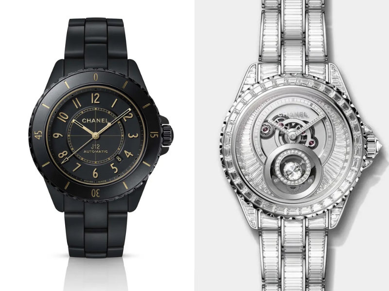 J12 tiếp tục hành trình tái định nghĩa sự năng động đương đại. Trong năm 2026, dòng đồng hồ gốm biểu tượng này mở rộng ngôn ngữ với sự đa dạng về kích thước và chất liệu. Nếu phiên bản 28mm mang đến nét tinh gọn, nữ tính với dây cao su, thì J12 Golden Black lại tạo ra sự tương phản sắc nét giữa gốm đen mờ và chi tiết mạ vàng sang trọng. Đỉnh cao kỹ thuật thuộc về J12 Diamonds Tourbillon Caliber 5. Đây là bộ chuyển động tourbillon cơ học đầu tiên được phát triển hoàn toàn in-house. Cấu trúc tourbillon bay được bao quanh bởi các viên kim cương cắt giác baguette, với tâm điểm là viên kim cương 0,18 carat có 65 mặt cắt, xoay chuyển nhịp nhàng theo từng giây, tạo nên hiệu ứng thị giác thôi miên đầy mê hoặc.