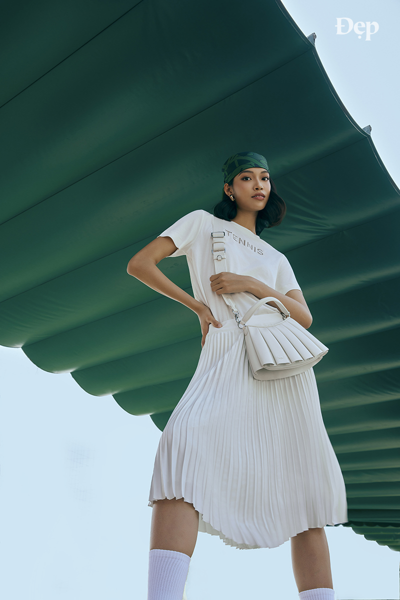 Túi Lenglen trở lại với bề mặt xếp nếp gợi liên tưởng đến chân váy tennis, phần tay cầm được lấy cảm hứng từ cây vợt.